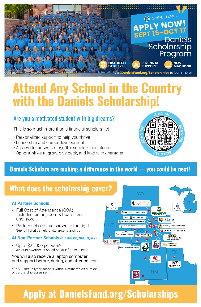 There is less than one week left for students to apply for the life-changing Daniels Scholarship. Key Information on the Scholarship Awarded to 200+ students each year from Colorado, New Mexico, Utah and Wyoming. Provides up to a full ride at 22 partner colleges and universities in CO, NM, UT, WY, TX and MI For […]