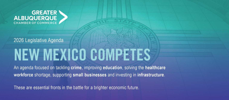 Today, the Chamber’s Board of Directors approved the 2026 Legislative Agenda which guides our lobbying and communications efforts during the current session of the legislature. Our theme is straightforward and compelling — New Mexico Competes. Our goal is to make our city and state a great place to start and grow a business and a safe, exciting place to work and raise a family.
