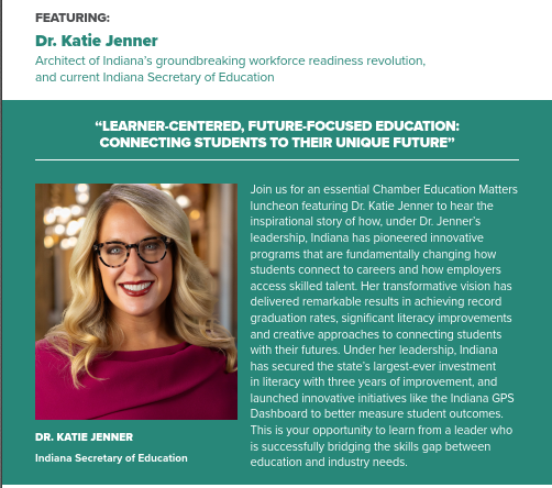 luncheon featuring Dr. Katie Jenner to hear the inspirational story of how, under Dr. Jenner’s leadership, Indiana has pioneered innovative programs that are fundamentally changing how students connect to careers and how employers access skilled talent. Her transformative vision has delivered remarkable results in achieving record graduation rates, significant literacy improvements and creative approaches to connecting students with their futures.