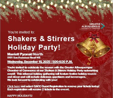 You’re invited to celebrate the season with the Greater Albuquerque Chamber of Commerce at our Shakers & Stirrers Holiday Party networking event! This informal holiday gathering will feature festive holiday music and décor and will include delicious appetizers and beverages.
