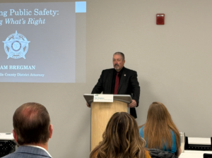 District Attorney Sam Bregman presented information on crime trends in the metro area and specific areas of concern, such as juvenile crime, competency issues and the judicial system’s tendency toward the pre-trial release of people who get arrested.