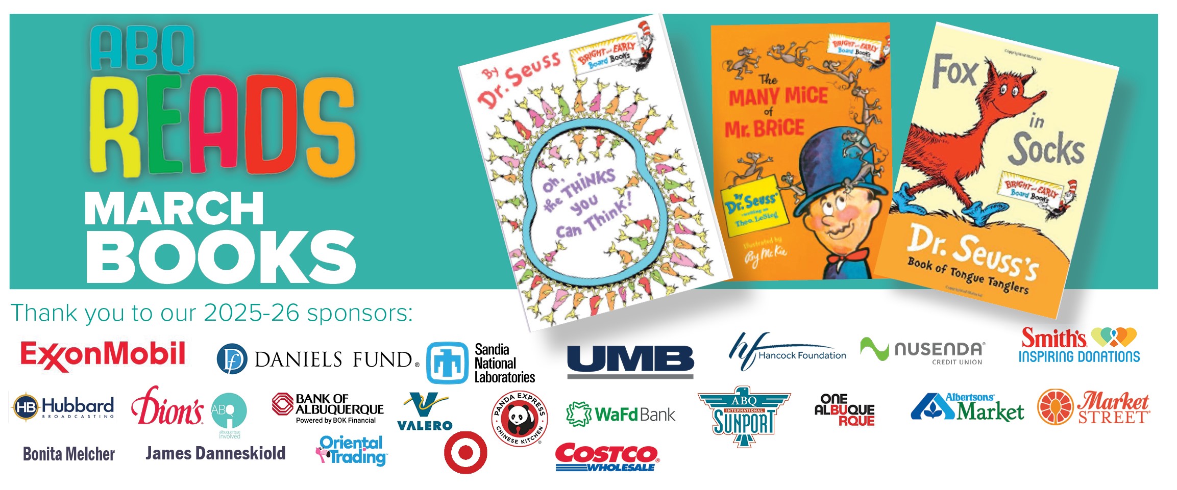 A big thank you goes out to our sponsors to date who make giving the gift of literacy possible: ExxonMobil, Honeywell/Sandia, Daniels Fund, UMB, Hubbard Broadcasting, Hancock Family Foundation, Nusenda Credit Union, Albertsons/Market Street, Bank of Albuquerque, DSRM National Bank/Valero, WaFd Bank, Albuquerque Involved, James Danneskiold, Bonita Melcher, Oriental Trading Co., Panda Express, Dion’s, Target, Costco Wholesale and Smith’s Inspiring Donations.